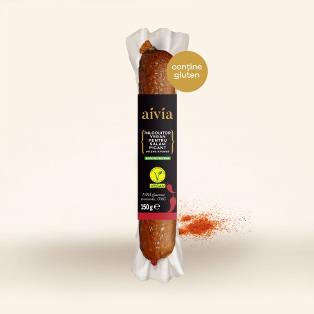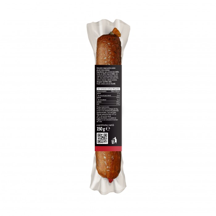 ingrediente: apă, proteină din GRÂU, boabe de SOIA, fulgi de OVĂZ, ulei vegetal de floarea soarelui, usturoi, sare, boia dulce (2%), boia iute (2%), chimen măcinat, chimen semințe, usturoi granulat. Alergeni: GRÂU, SOIA, OVĂZ. Poate conține urme de ȚELINĂ.