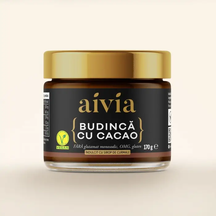 O combinaţie rafinată de ingrediente vegane de cea mai înaltă calitate. Budinca de ciocolată Aivia reprezintă opţiunea perfectă pentru cei care doresc să se bucure de răsfăţul ciocolatei într-o forma delicioasă şi sănătoasă, fără E-uri şi fără zahăr adăugat!